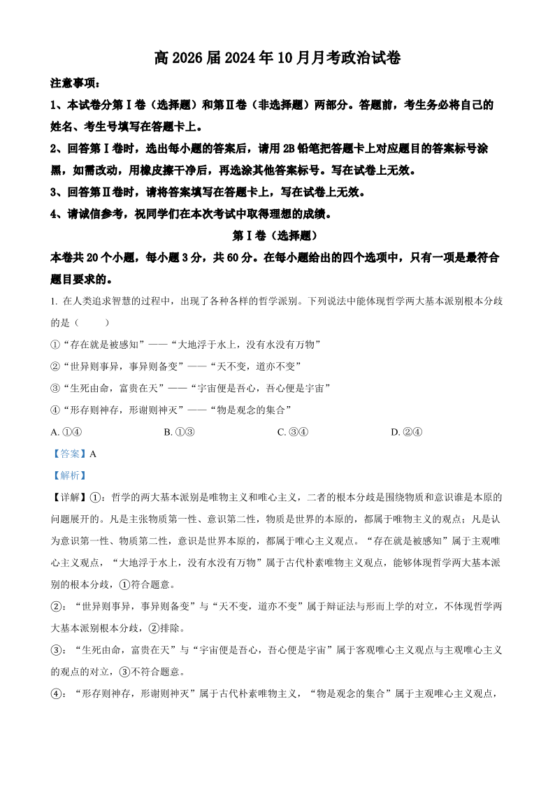 重庆市铜梁一中2024-2025学年高二上学期10月月考 政治答案