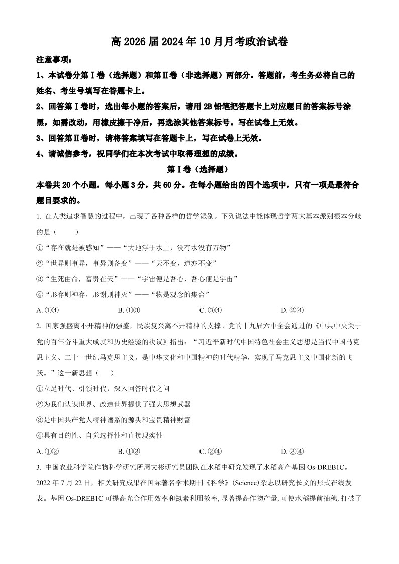 重庆市铜梁一中2024-2025学年高二上学期10月月考 政治