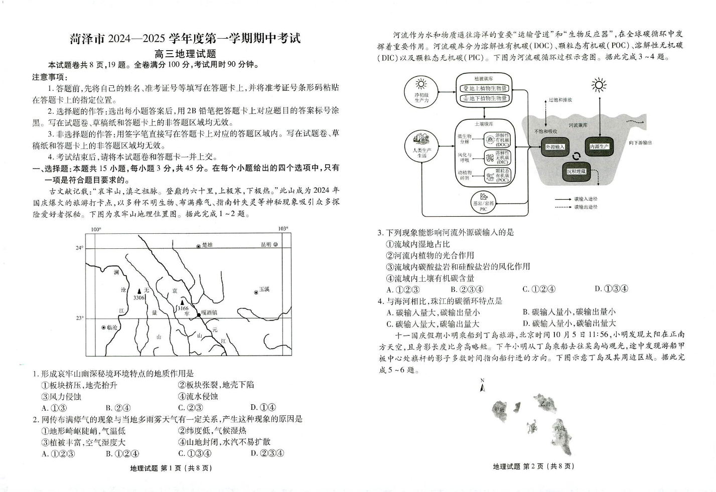 菏泽市2024-2025学年度第一学期期中考试 地理