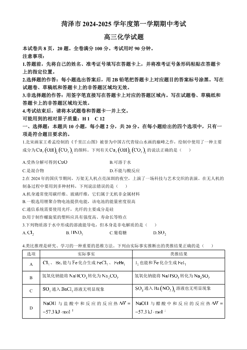 菏泽市2024-2025学年度第一学期期中考试 化学