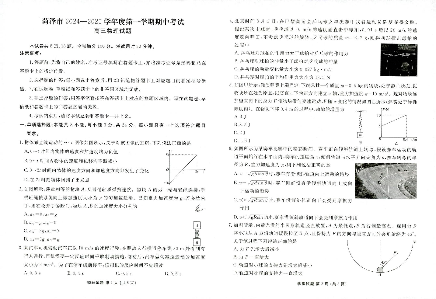菏泽市2024-2025学年度第一学期期中考试 物理