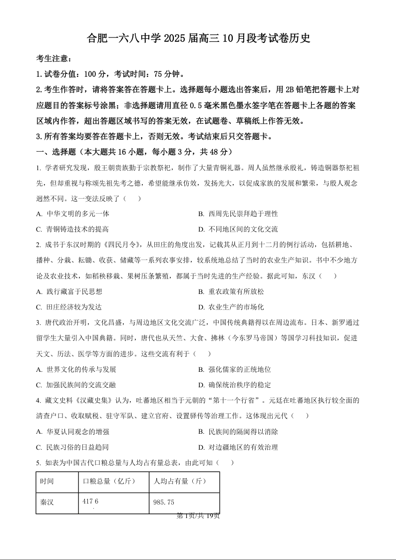 安徽省合肥一六八中学2025届高三上学期10月段考 历史