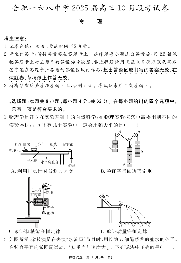 安徽省合肥一六八中学2025届高三上学期10月段考 物理