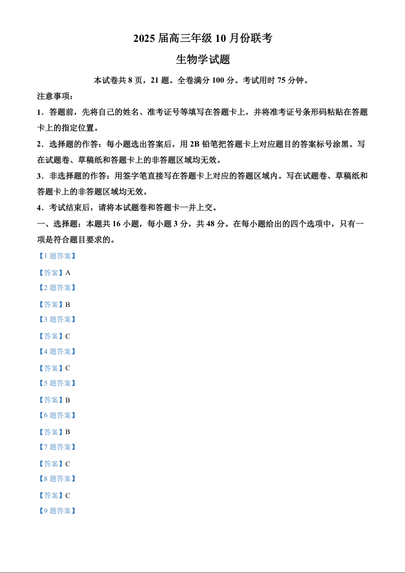 晋豫名校联盟2025届高三年级10月份联考 生物答案