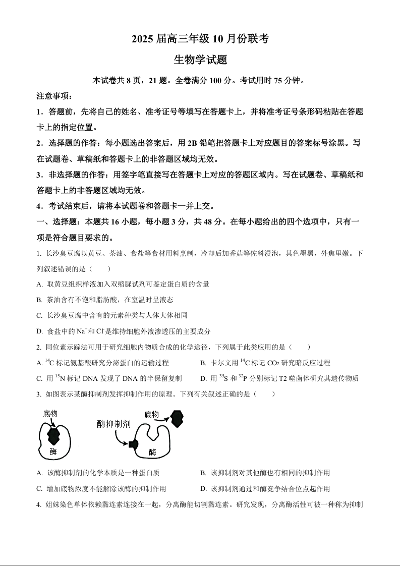 晋豫名校联盟2025届高三年级10月份联考 生物