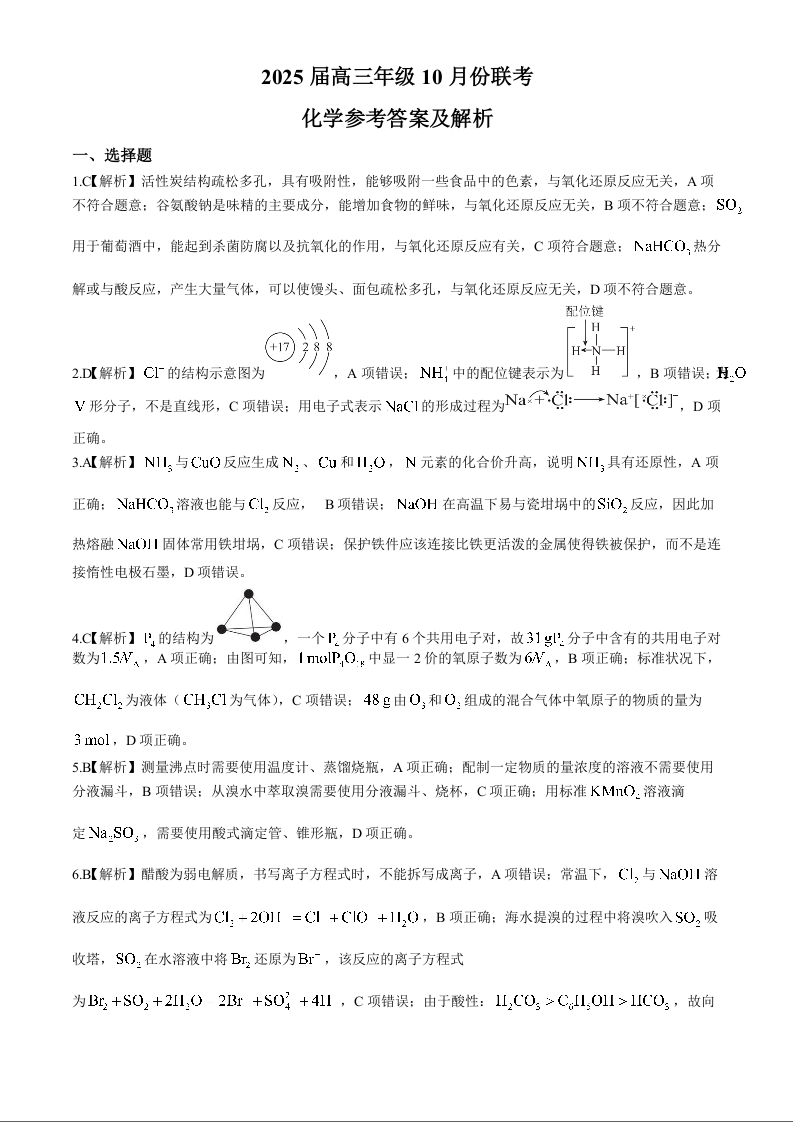 晋豫名校联盟2025届高三年级10月份联考 化学答案