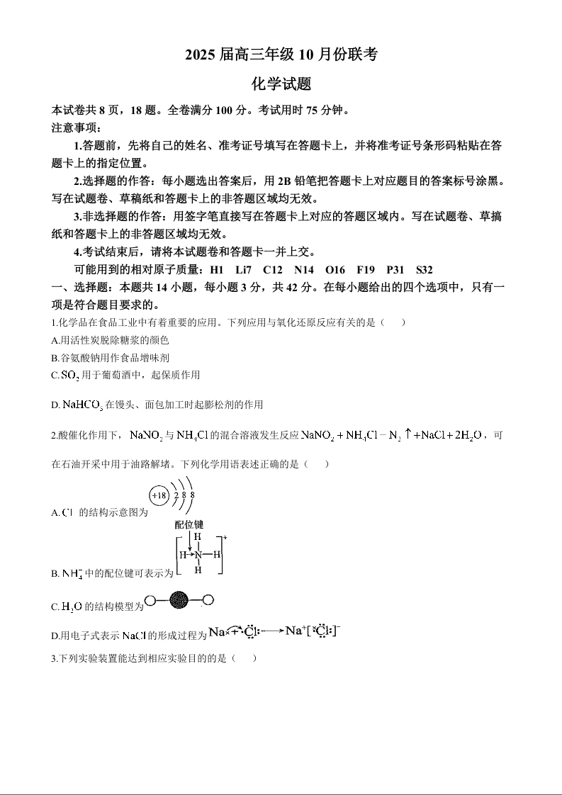 晋豫名校联盟2025届高三年级10月份联考 化学