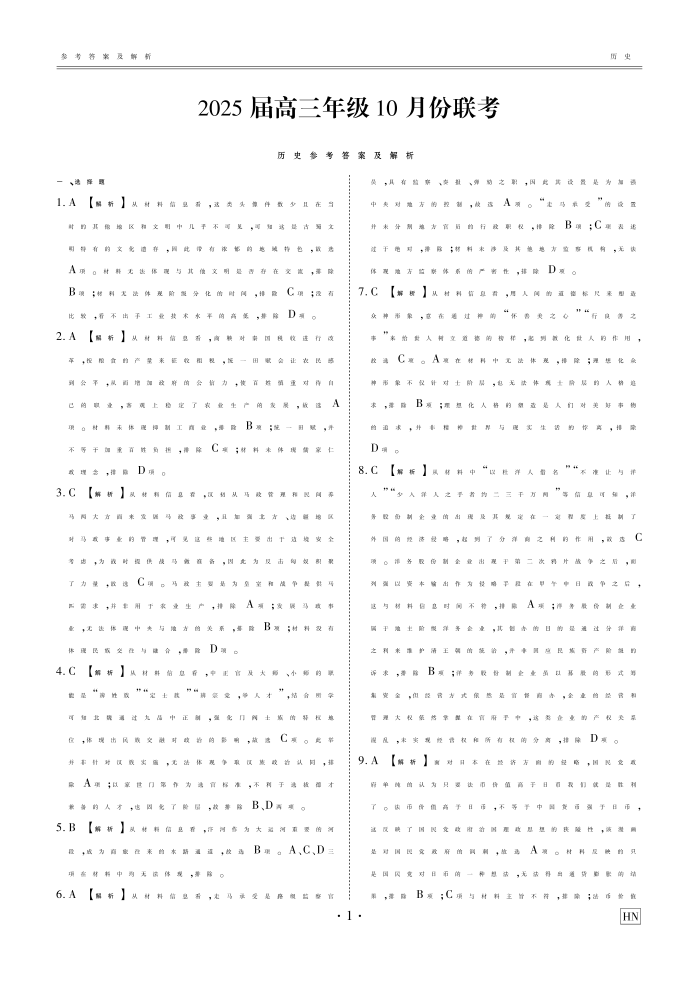 晋豫名校联盟2025届高三年级10月份联考 历史答案