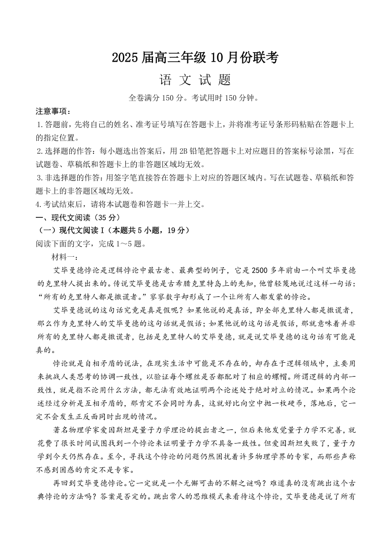 晋豫名校联盟2025届高三年级10月份联考 语文