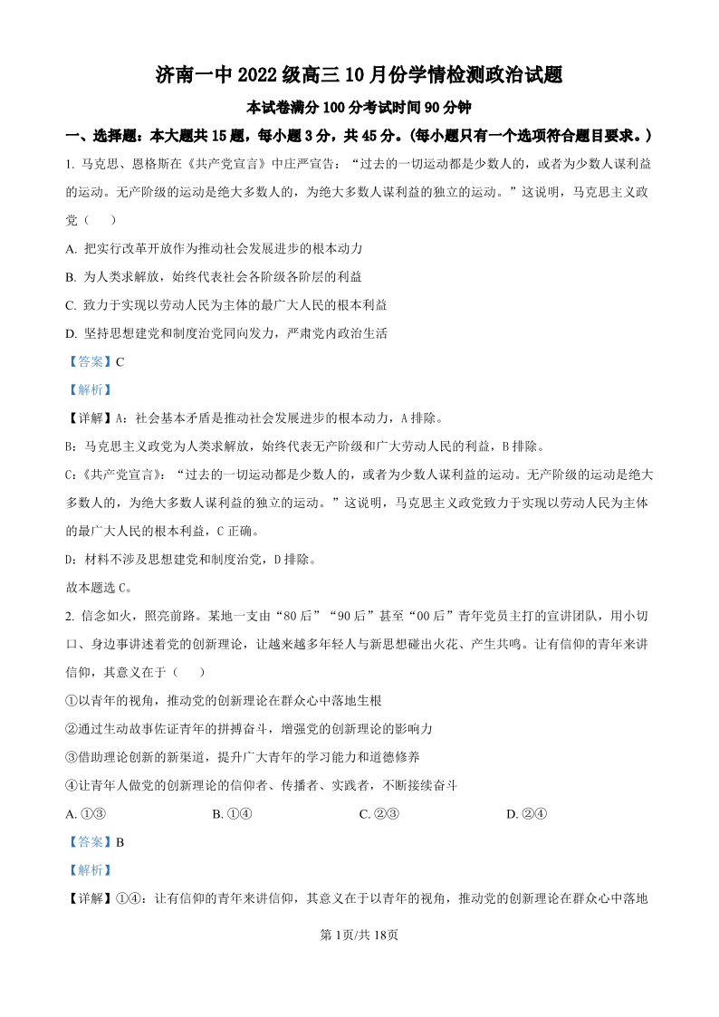 山东省济南一中2022级高三10月份学情检测 政治答案