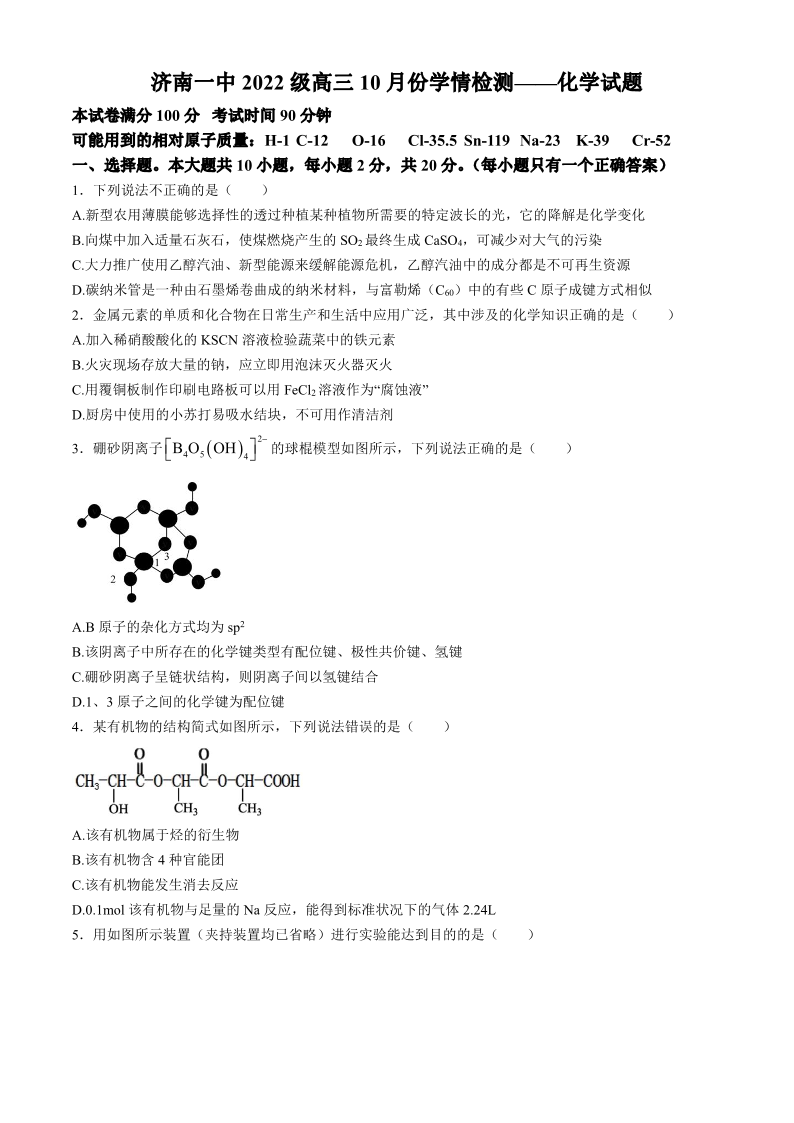 山东省济南一中2022级高三10月份学情检测 化学