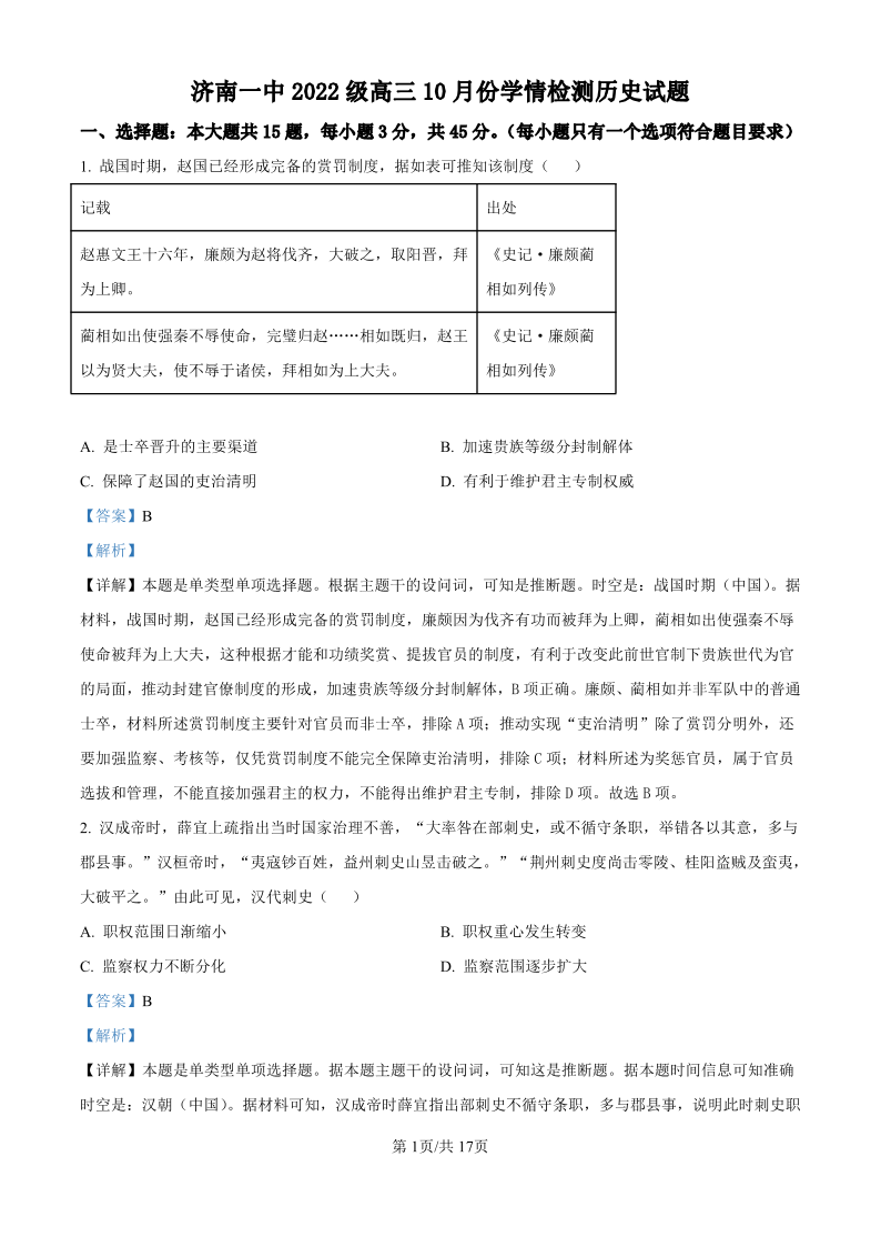 山东省济南一中2022级高三10月份学情检测 历史答案