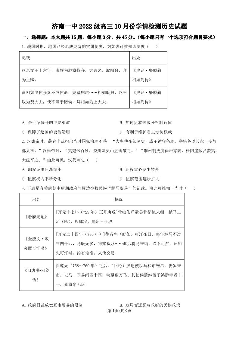 山东省济南一中2022级高三10月份学情检测 历史