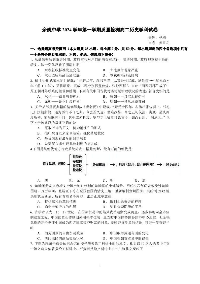 余姚中学2024学年高二年级第一学期质量检测 历史