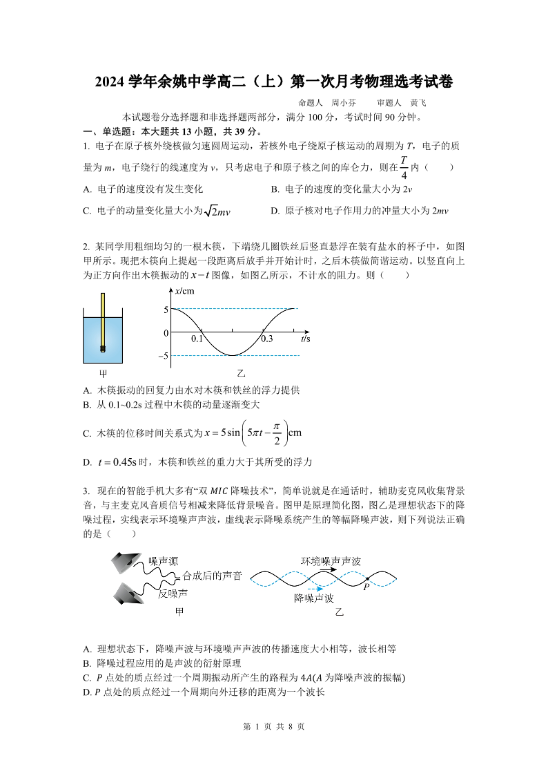 余姚中学2024学年高二年级第一学期质量检测 物理