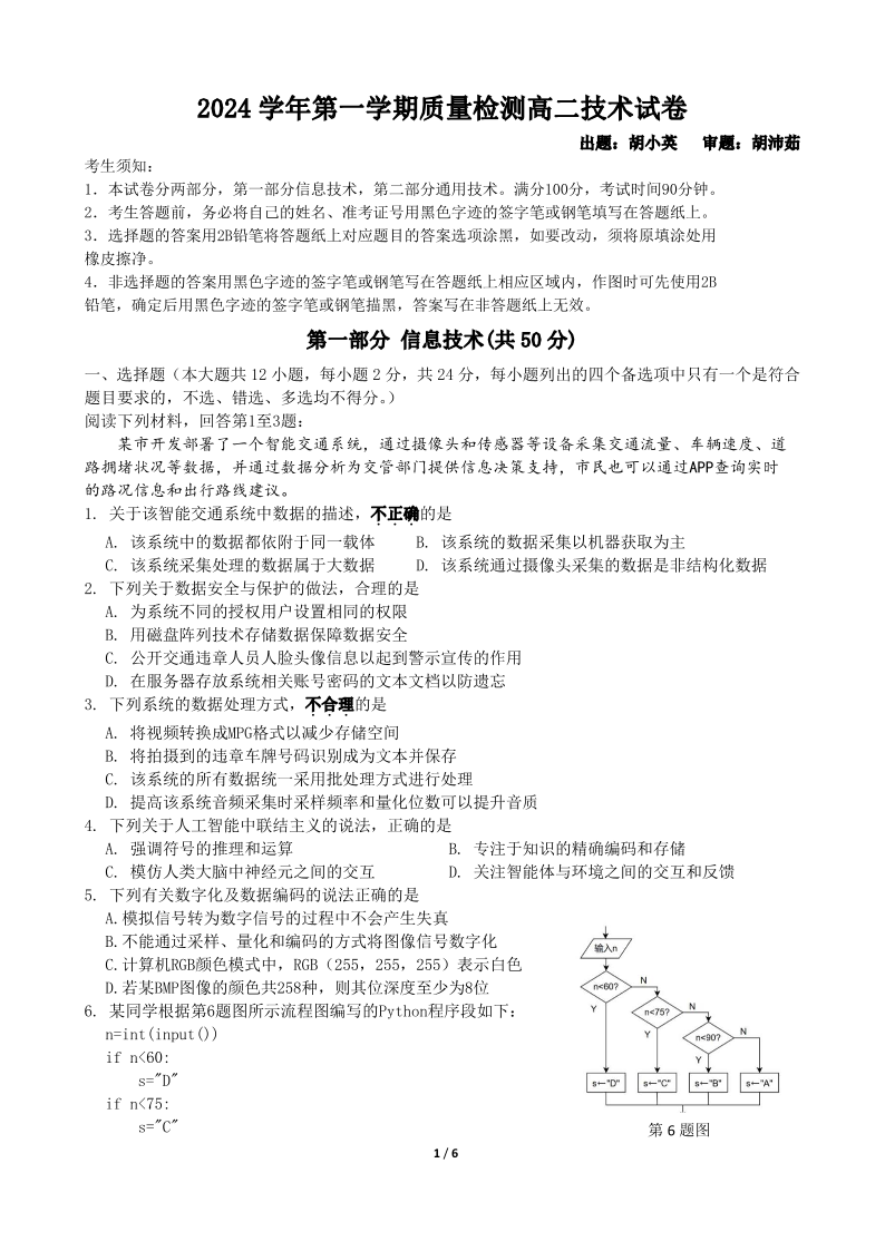 余姚中学2024学年高二年级第一学期质量检测 信息技术