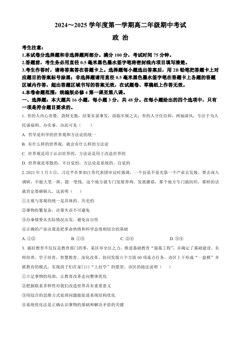 河北省沧州市八县联考2024-2025学年高二上学期10月期中考试 政治
