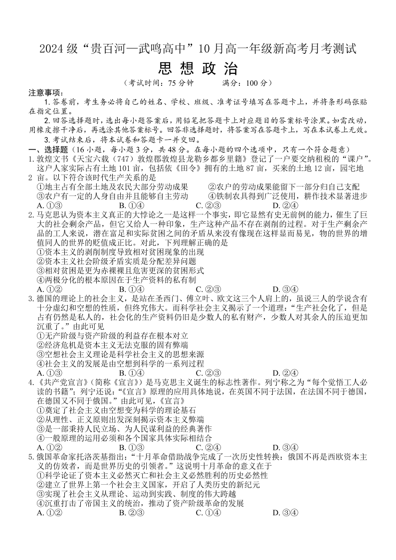 2024级“贵百河—武鸣高中”10月高一年级新高考月考测试 政治
