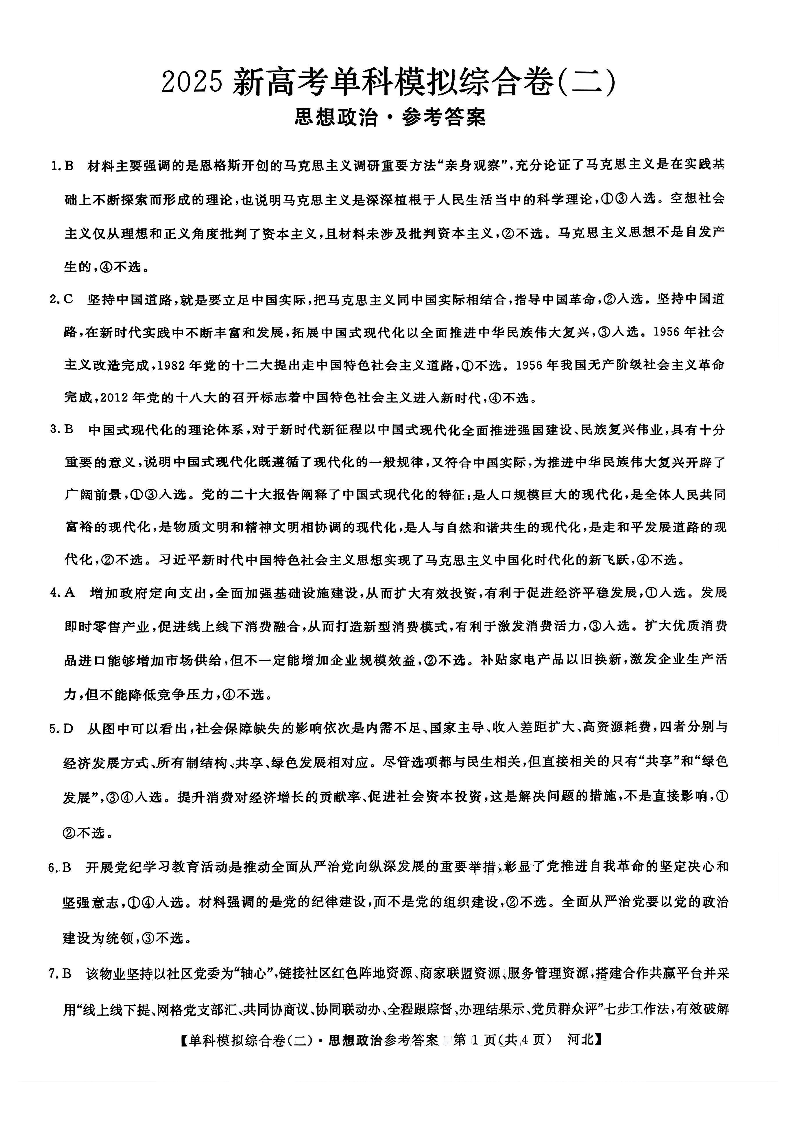 河北省2025届高三上学期新高考单科模拟综合卷(二)政治答案