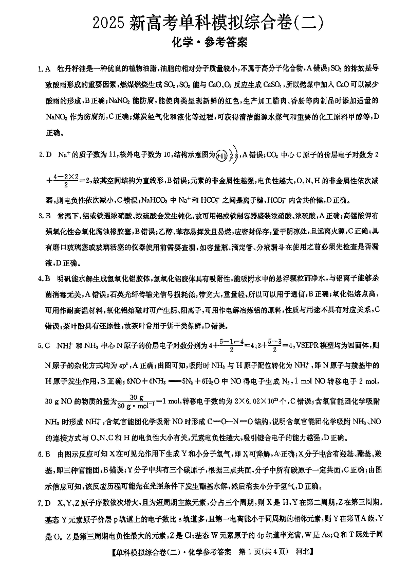 河北省2025届高三上学期新高考单科模拟综合卷(二)化学答案