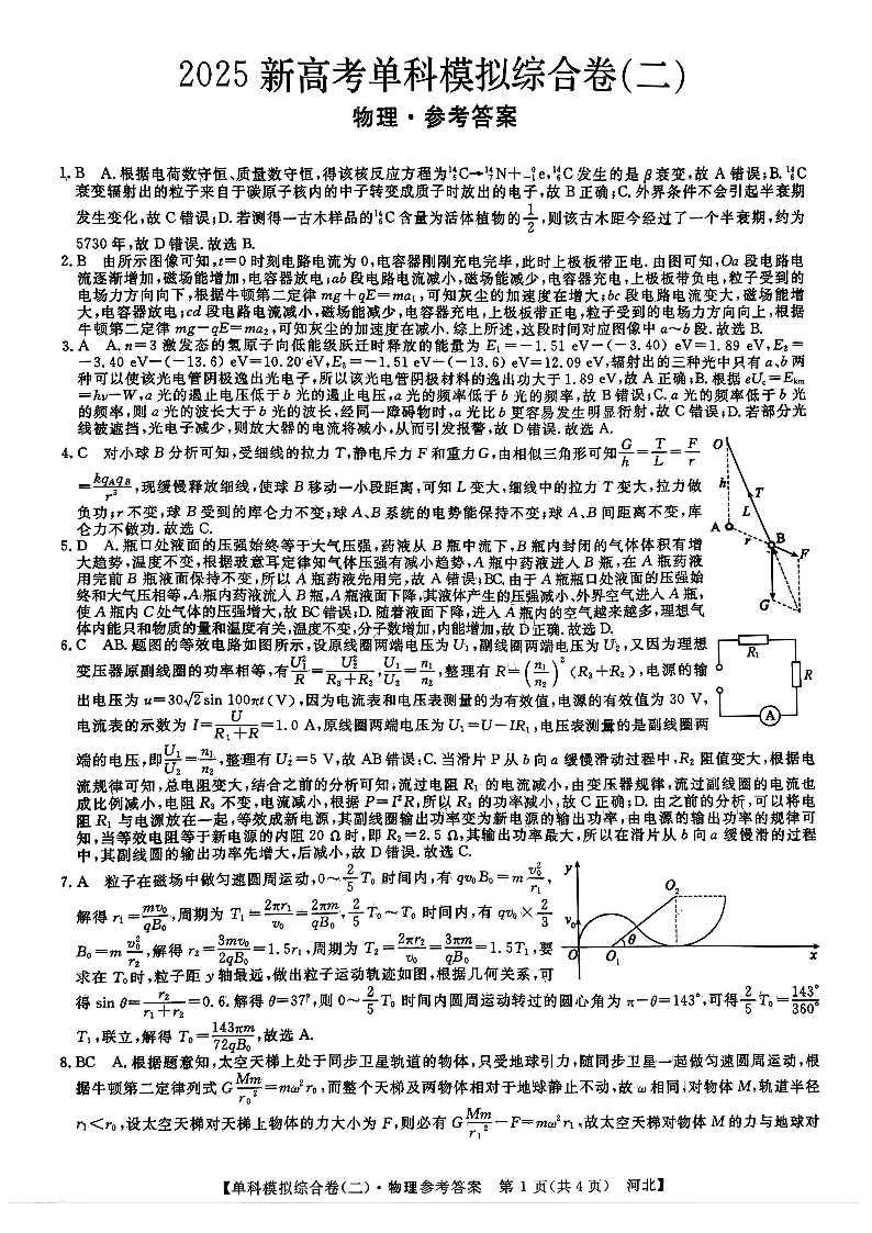 河北省2025届高三上学期新高考单科模拟综合卷(二)物理答案