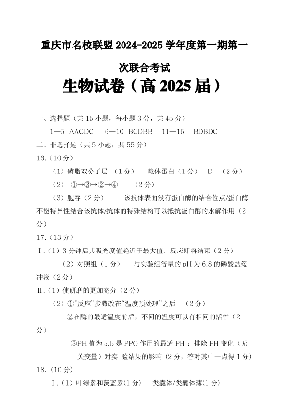 重庆市名校联盟2024-2025学年高三第一期第一次联合考试 生物答案