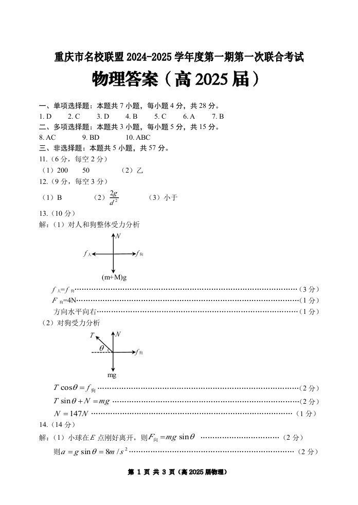 重庆市名校联盟2024-2025学年高三第一期第一次联合考试 物理答案