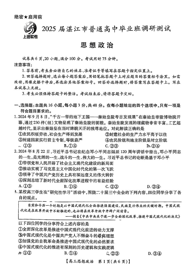2025届湛江市普通高中毕业班10月调研测试 政治