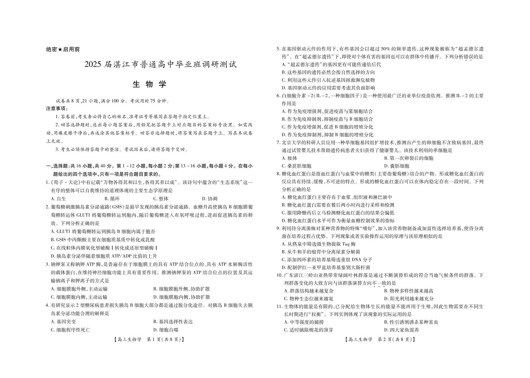 2025届湛江市普通高中毕业班10月调研测试 生物
