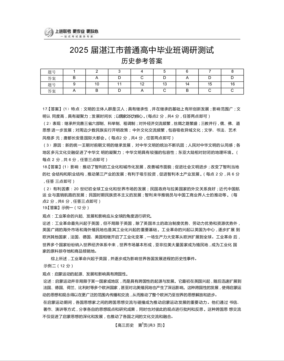 2025届湛江市普通高中毕业班10月调研测试 历史答案