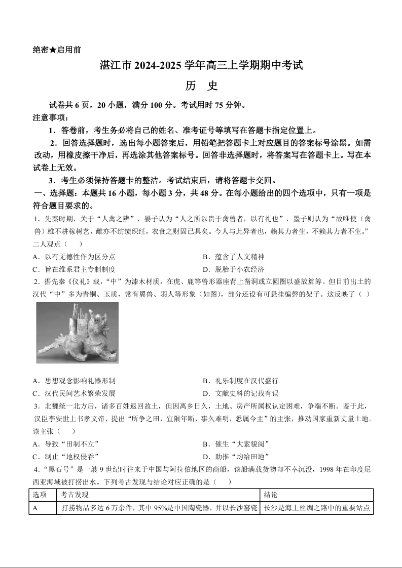 2025届湛江市普通高中毕业班10月调研测试 历史