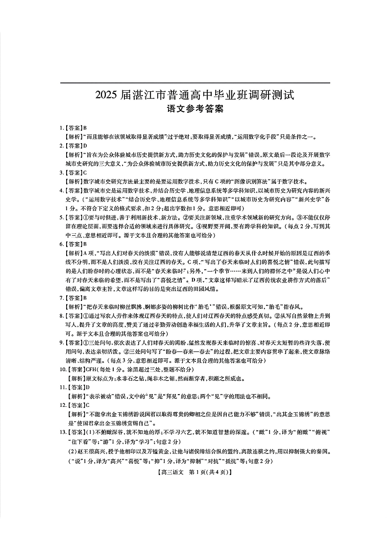 2025届湛江市普通高中毕业班10月调研测试 语文答案