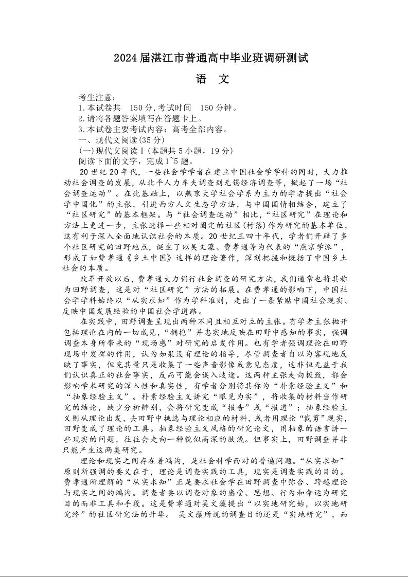 2025届湛江市普通高中毕业班10月调研测试 语文