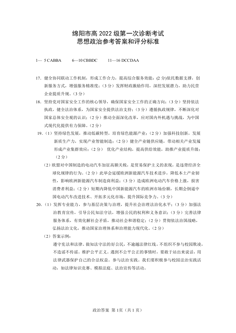 绵阳市高中2022级第一次诊断性考试 政治答案