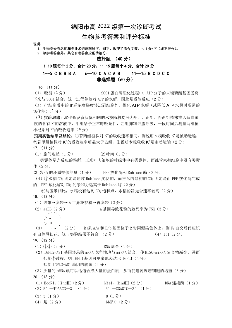 绵阳市高中2022级第一次诊断性考试 生物答案