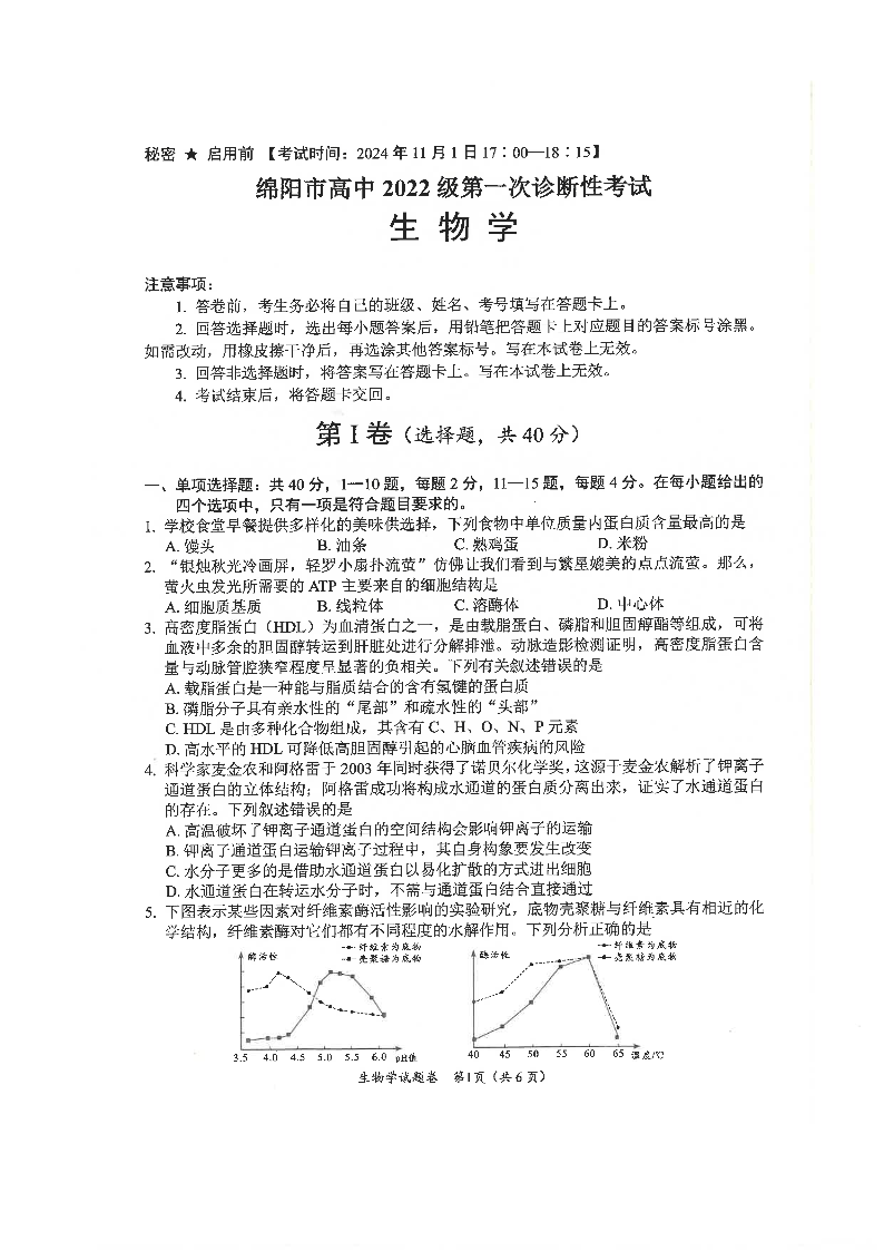 绵阳市高中2022级第一次诊断性考试 生物