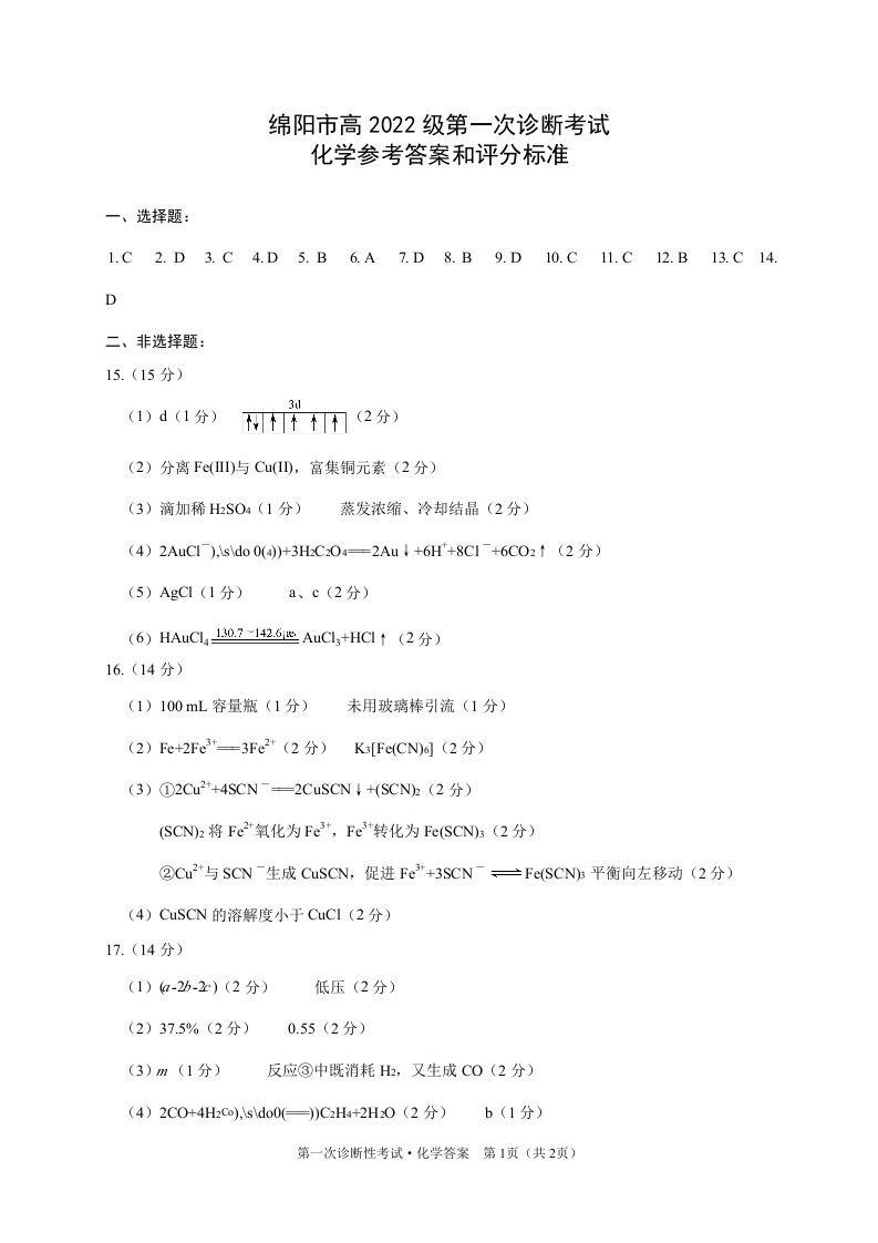 绵阳市高中2022级第一次诊断性考试 化学答案