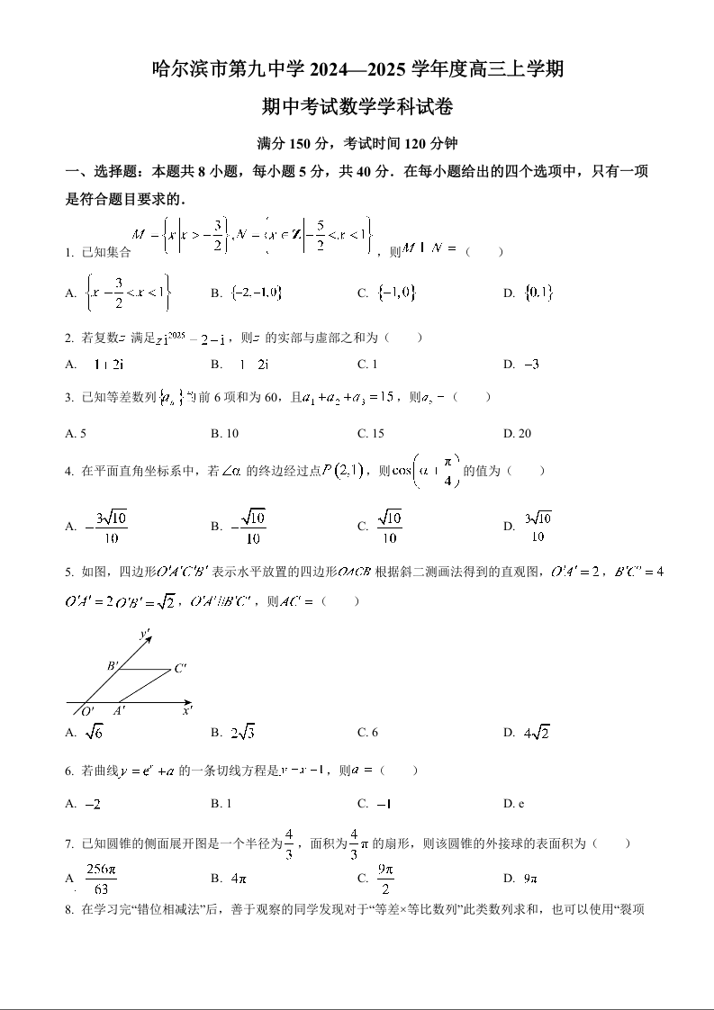黑龙江省哈尔滨市第九中学2024-2025学年高三上学期期中考试 数学