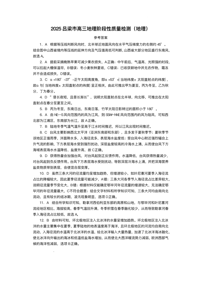 山西省吕梁市2024-2025学年高三年级阶段性测试 地理答案