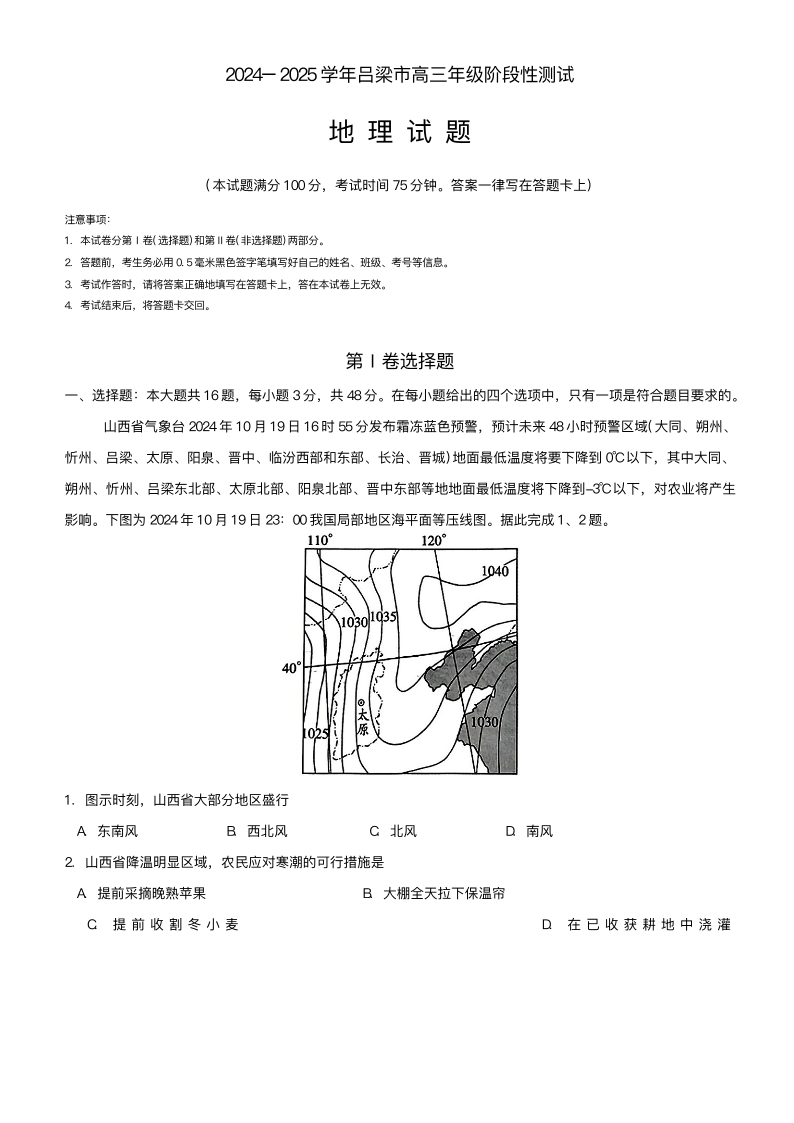 山西省吕梁市2024-2025学年高三年级阶段性测试 地理