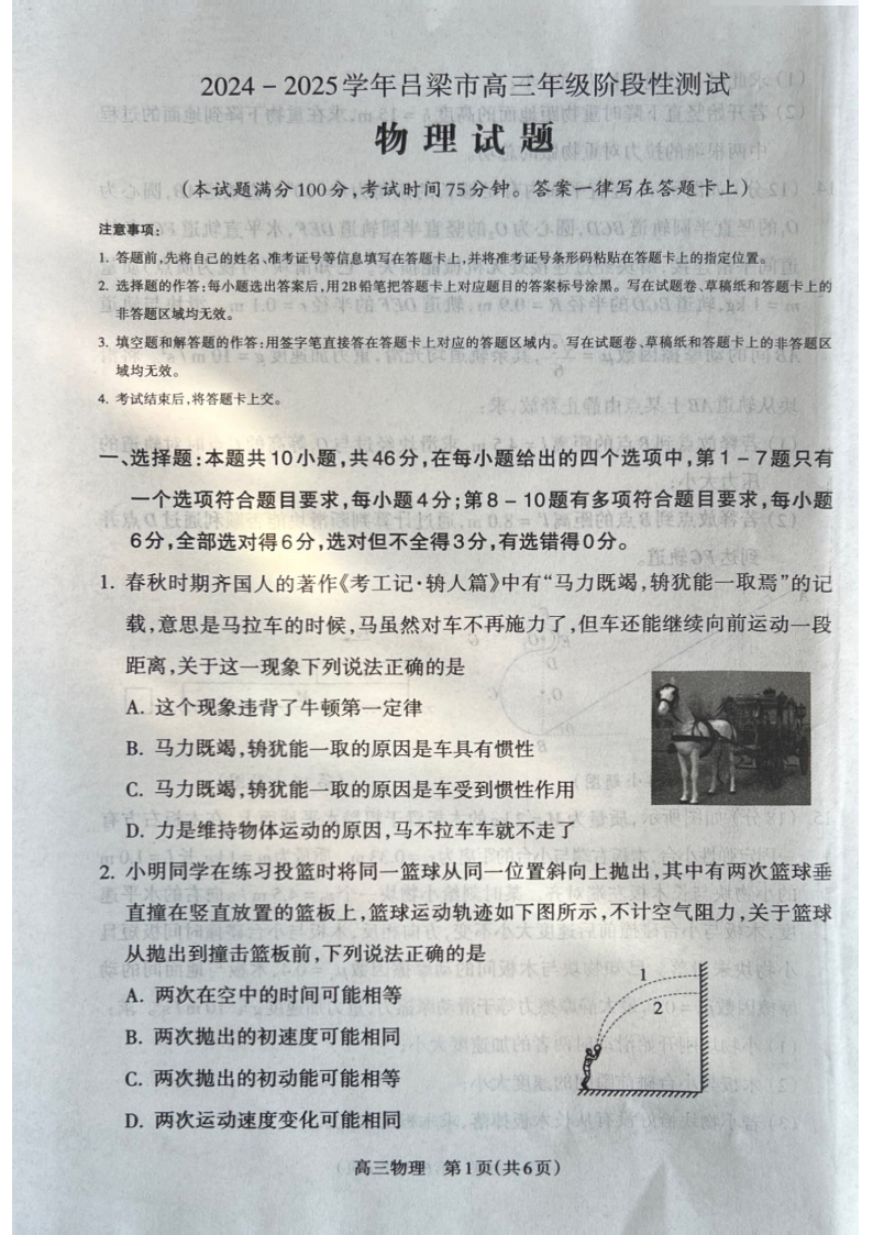 山西省吕梁市2024-2025学年高三年级阶段性测试 物理