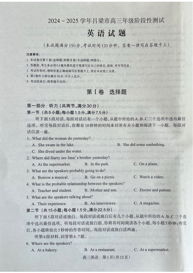 山西省吕梁市2024-2025学年高三年级阶段性测试 英语