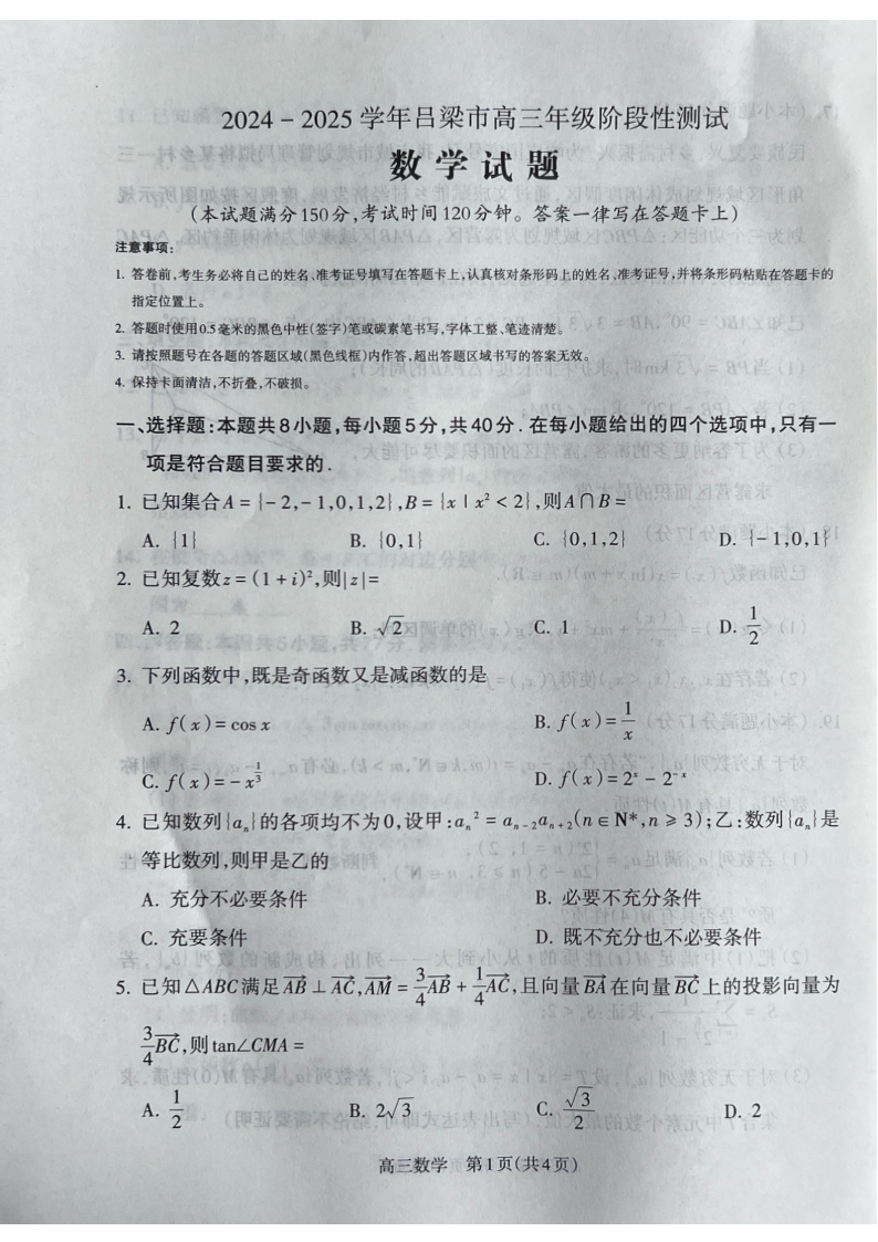 山西省吕梁市2024-2025学年高三年级阶段性测试 数学