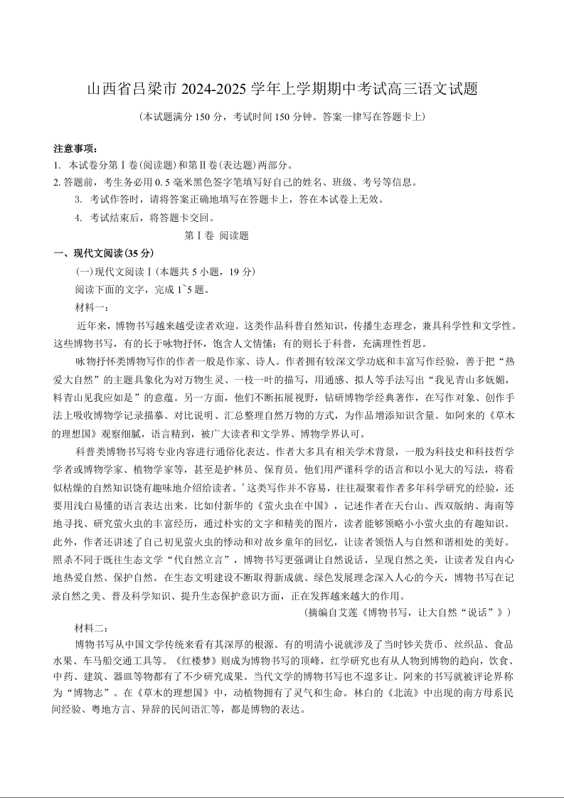 山西省吕梁市2024-2025学年高三年级阶段性测试 语文