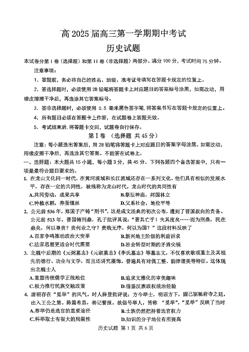 重庆主城五区高三期中 历史