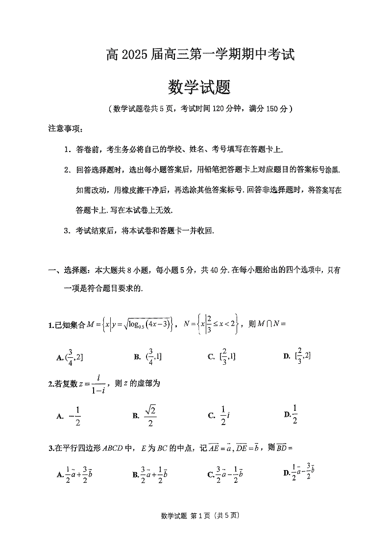 重庆主城五区高三期中 数学