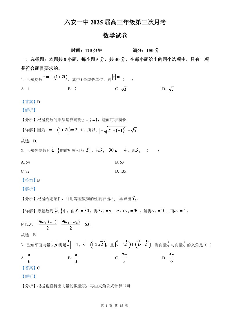 安徽省六安第一中学2025届高三上学期第三次月考(11月)数学答案