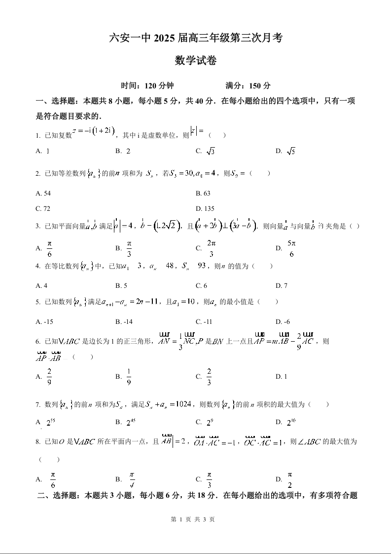 安徽省六安第一中学2025届高三上学期第三次月考(11月)数学试题