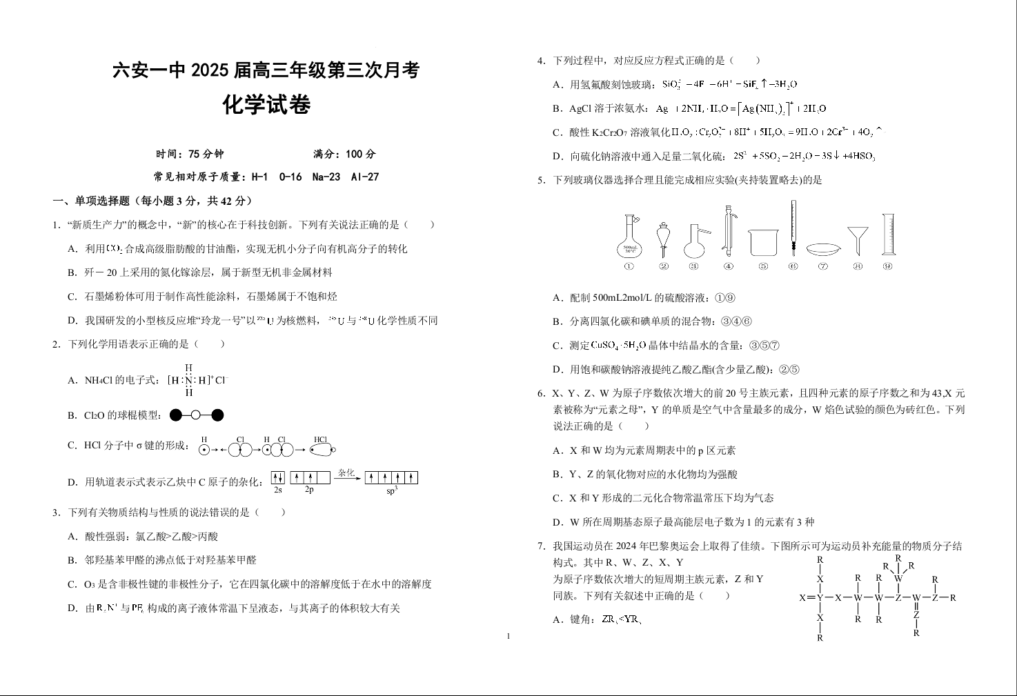 安徽省六安第一中学2025届高三上学期第三次月考(11月)化学试题+答案