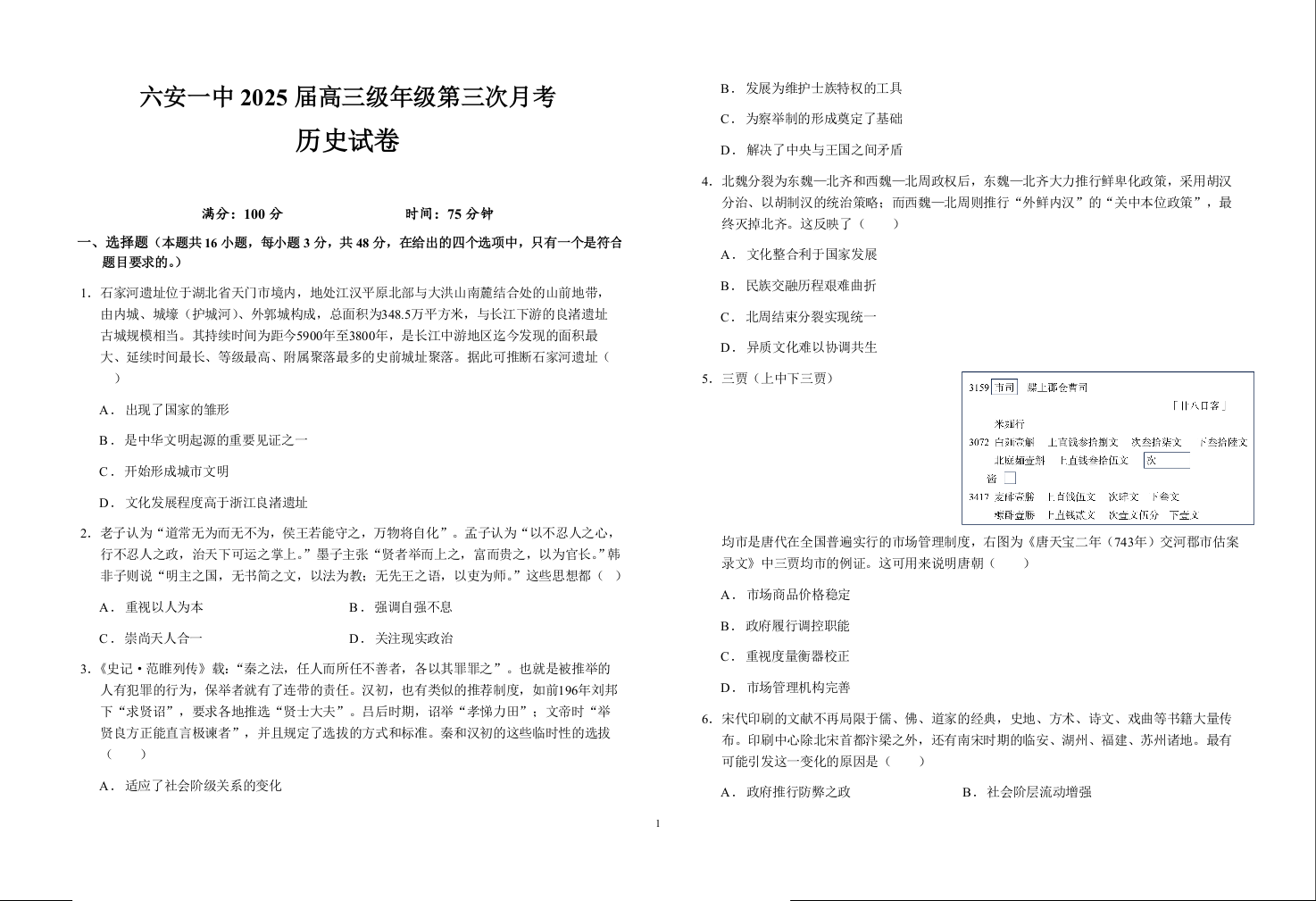 安徽省六安第一中学2025届高三上学期第三次月考(11月)历史试题+答案